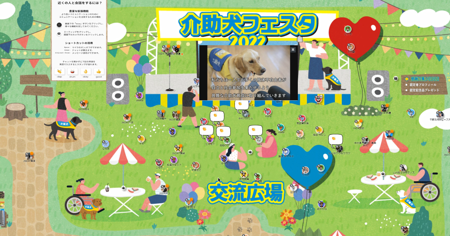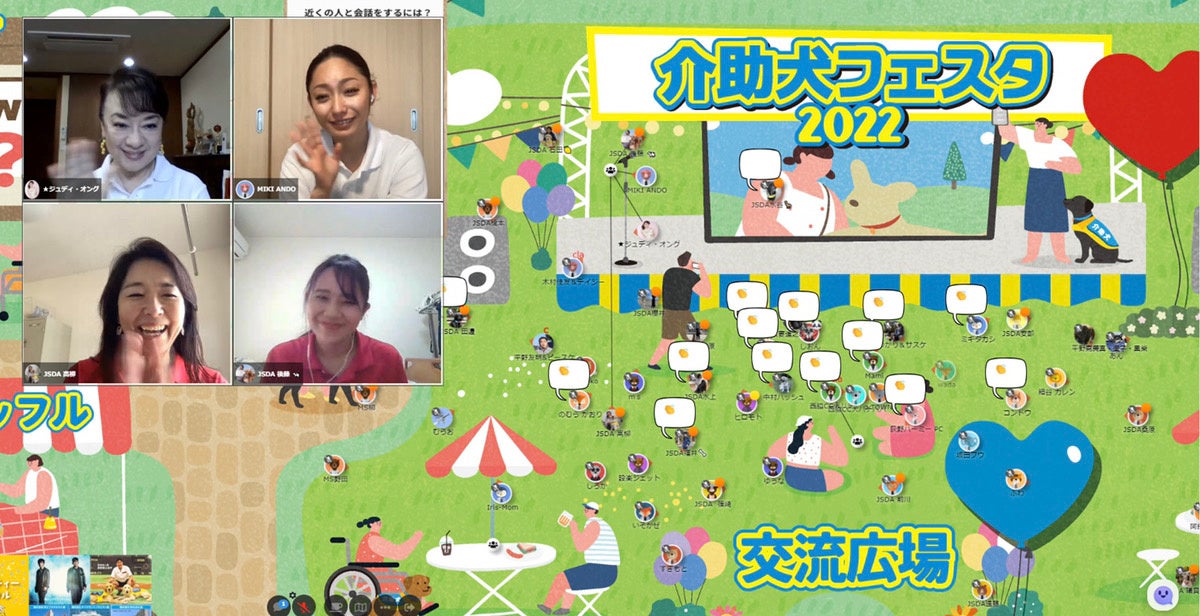 介助犬フェスタ(https://kaijoken-festa.jp/)とは、(社福)日本介助犬協会(以下、協会)が毎年5月に開催しており、介助犬を多くの方に知ってもらいたいという思いから始めたイベントである。今までに12回開催しており、オンライン開催は3回目となった。今年は、協会の公式Youtubeチャンネルにて動画コンテンツの投稿や当日生配信を行うだけでなく、昨今注目されているメタバースを活用した『バーチャル会場』(株式会社oVice提供)を活用し、職員や介助犬使用者、参加者の交流も行った。