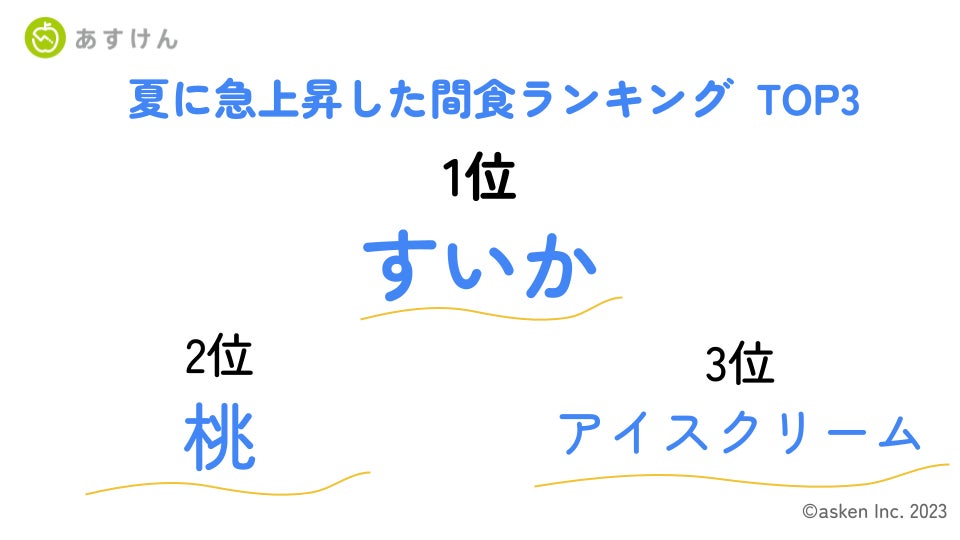 1位は「すいか」、2位「桃」、3位「アイスクリーム」となり、季節の旬の果物を中心に、冷やしても美味しくさっぱりと食べられる食べ物が上位にランクインしていました。