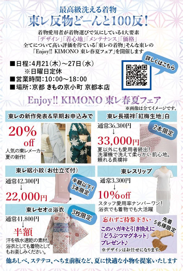 Enjoy!! KIMONO 着物販売イベント 最高級洗える着物 東レ春夏フェア 4/21㈭-27(水)