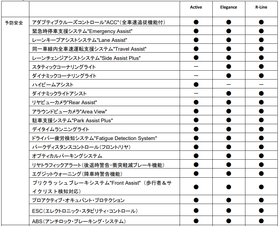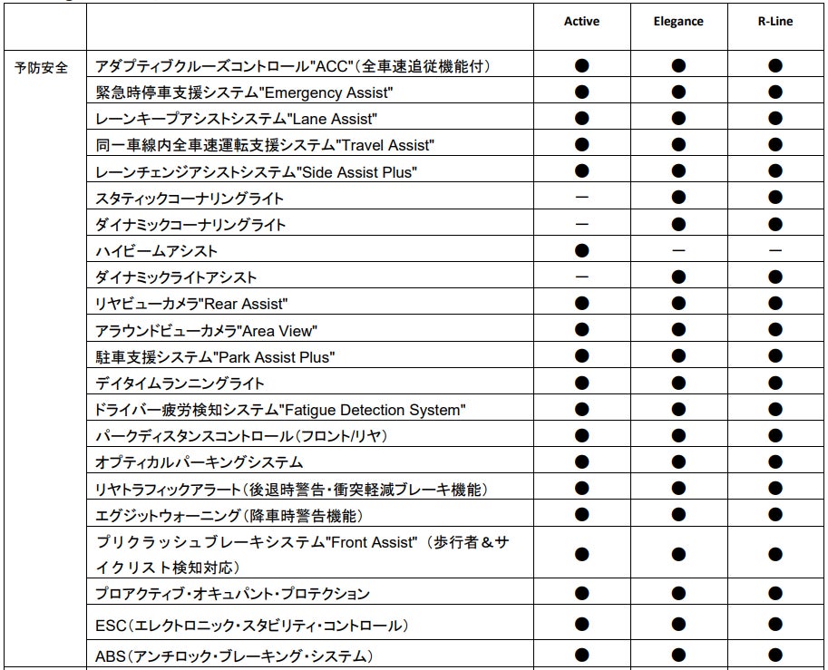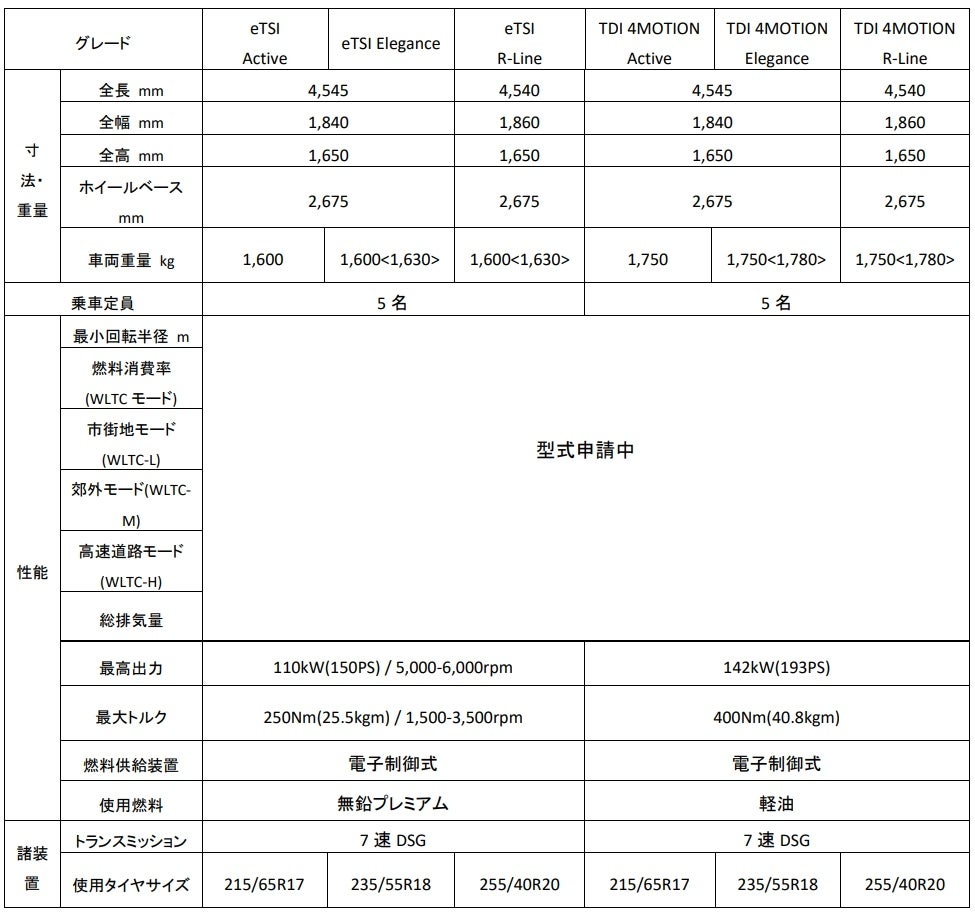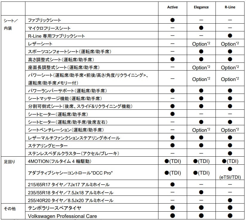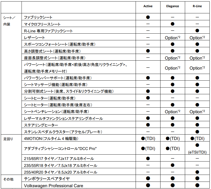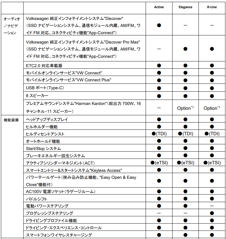 グレードは、1.5L eTSIエンジン、2.0L TDIエンジンともに”Travel Assist”やレーンキープアシストシステム”Lane Assist”、レーンチェンジアシストシステム"Side Assist Plus"などの最新の運転支援システムを標準装備としたエントリーグレード『Active』に加え、LEDマトリックスヘッドライト“IQ.LIGHT HD”や運転席/助手席のシートマッサージ機能を標準装備した『Elegance』、そして専用エクステリアを身に纏い、専用シートや20インチアルミホイールを装着した『R-Line』という3グレードを設定し、計6グレード展開となります。
