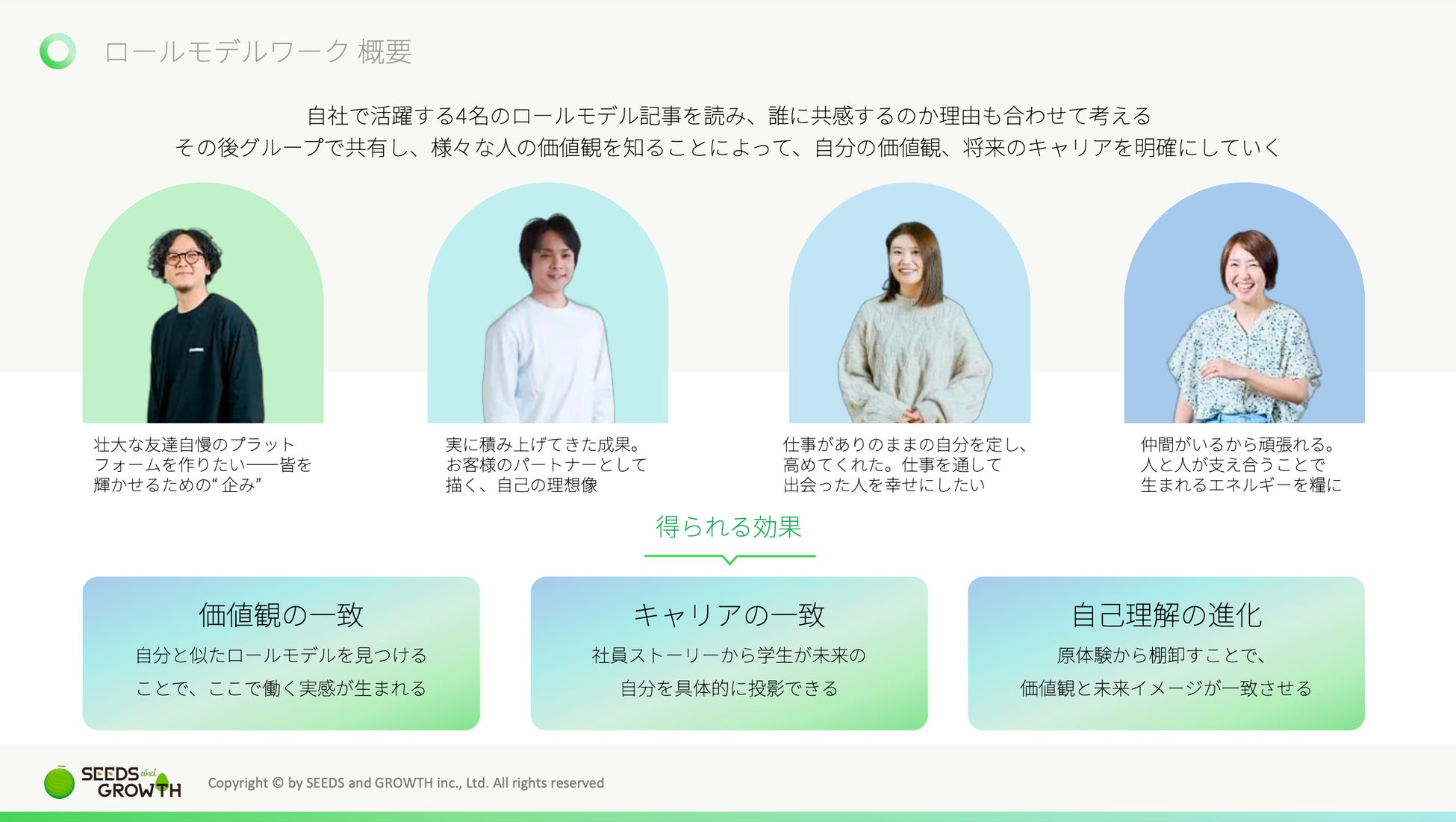 「ロールモデル就活・転職サイト」を運営し、累計1,200社以上の採用ブランディングを支援してきたtalentbookと、新卒採用領域で16業界300社以上の採用戦略策定から入社後の定着・活躍まで、一気通貫で支援してきたシーズアンドグロースが、この思想を内定者フォローに応用したのが、今回リリースする「ロールモデルワーク」です。