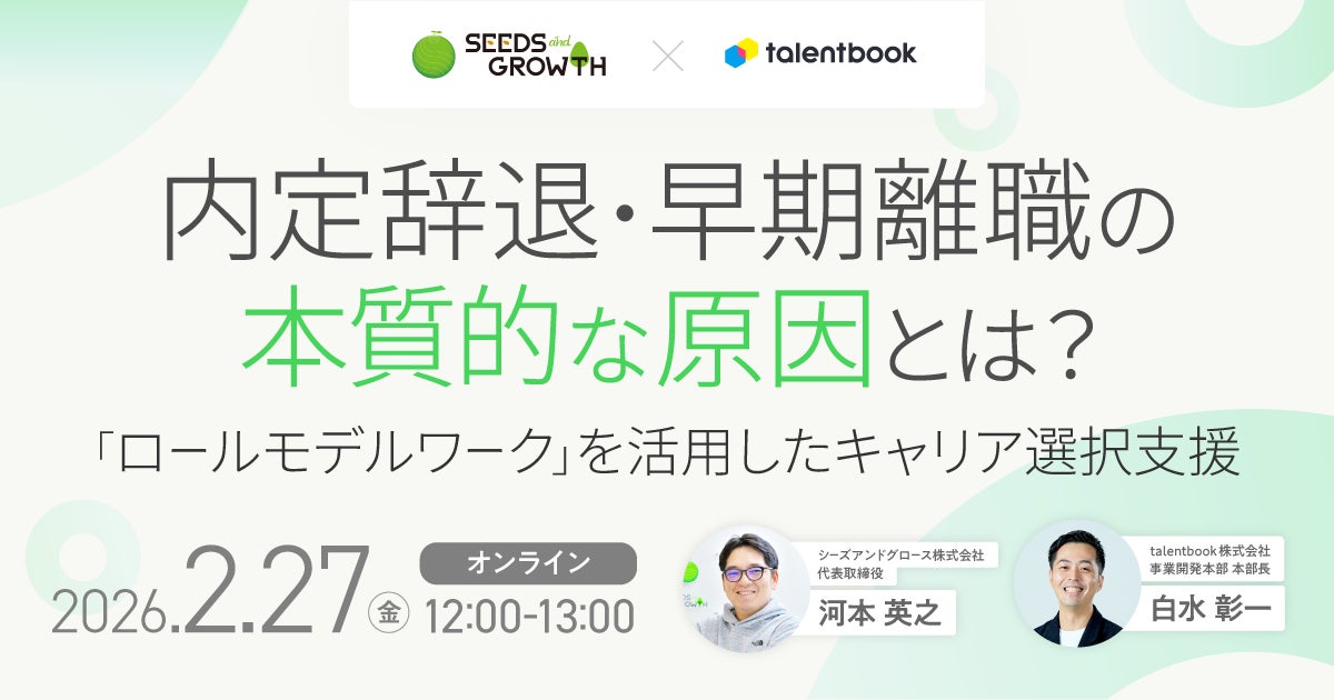 ロールモデル就活・転職サイト「talentbook」及び、法人向け採用CXソリューションを提供するtalentbook株式会社(本社:東京都渋谷区、共同代表取締役:大堀航/大堀海、以下「当社」)とシーズアンドグロース株式会社((本社:東京都中央区、代表取締役:河本英之)は、新しい内定者フォロープログラム「ロールモデルワーク」の提供を開始いたします。