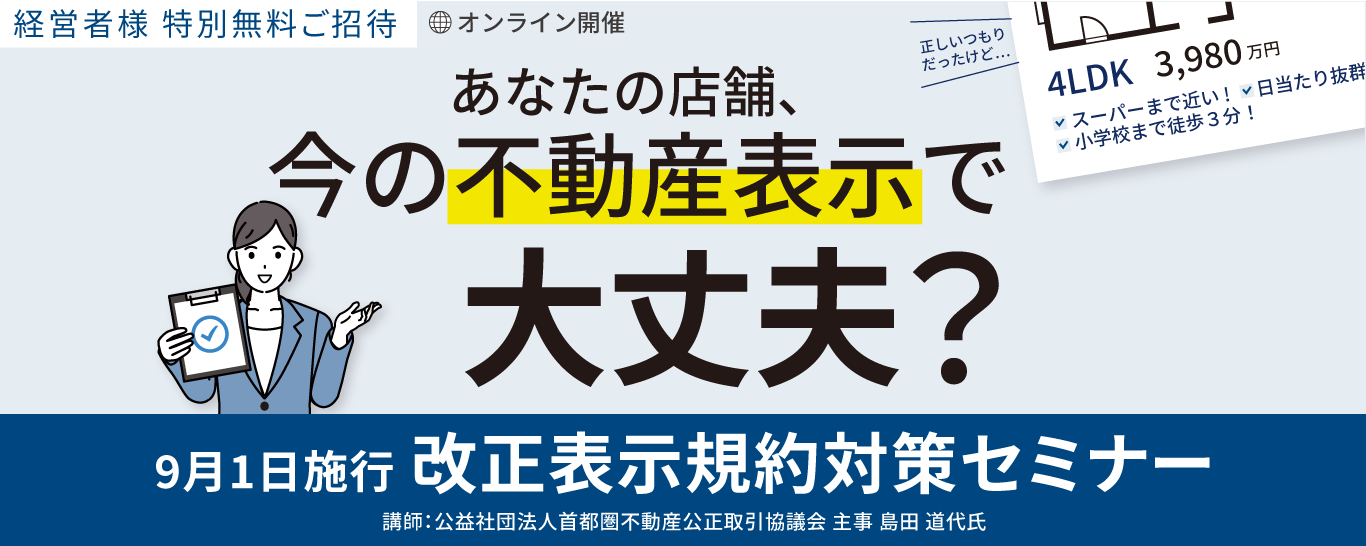 【不動産業者向】9月1日施行「改正表示規約」対策無料オンラインセミナー開催のお知らせ