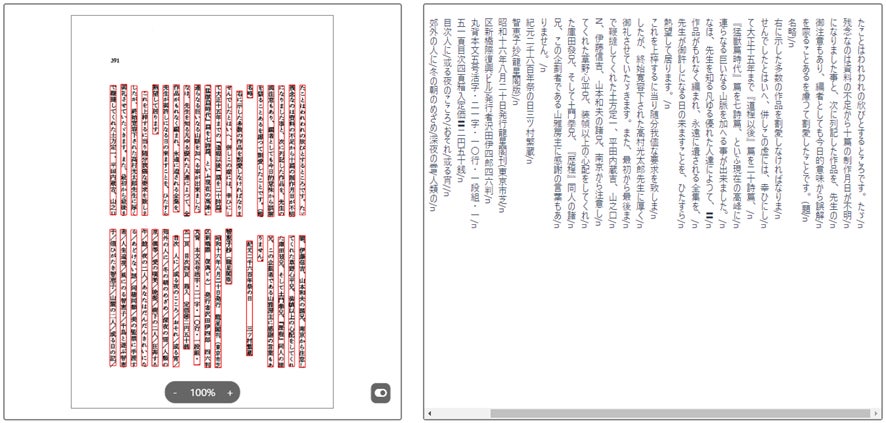 近代文学に多いルビと本文の区別は既存のOCRでは対応が難しかった近代文学に多いルビと本文の区別において、「FROG AI-OCR」では読み違いを起こさずに処理することが可能です。