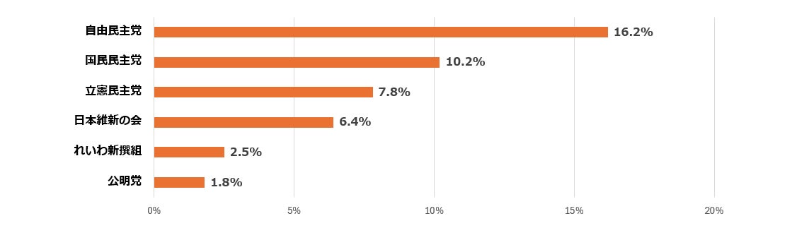 来夏の次期参院選比例代表で投票したい政党、投票したい候補者の所属する政党は自民16.2%がトップとなり、以下は国民10.2%、立憲7.8%、維新6.4%。
