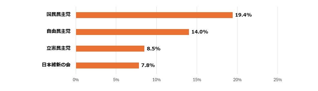 今後に期待できると最も感じる政党の上位は国民19.4%、自民14.0%、立憲8.5%、維新7.8%の順だった。