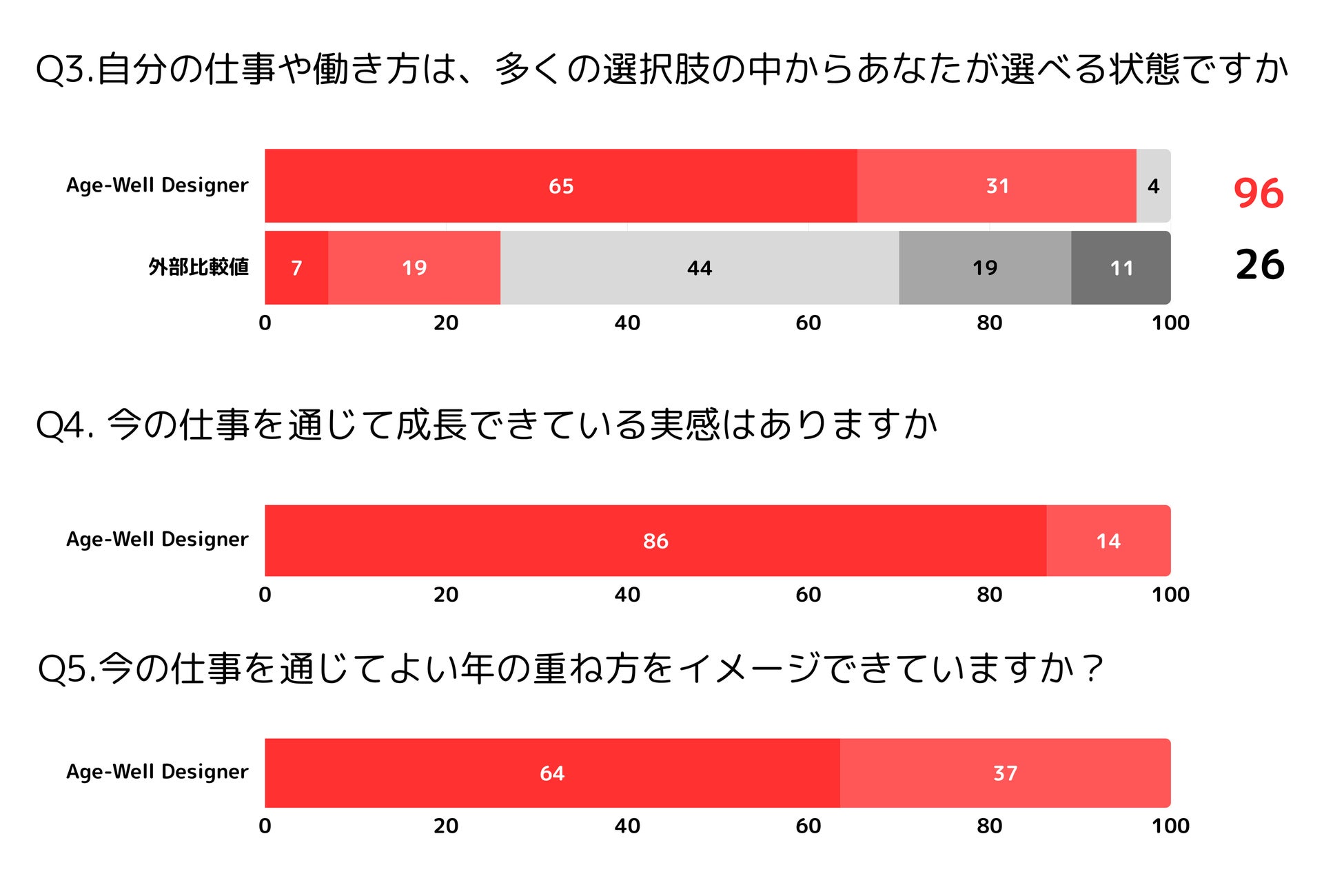 ・はたらくWell-being指標(Q1~Q3)において、TOP2項目の合算値を見ると、Age-Well Designerのスコアはすべての設問で外部比較値を大幅に上回る結果。