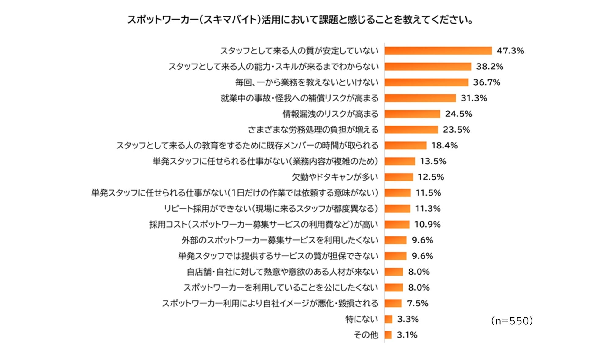 一方、「スポットワーカー活用において課題と感じること(複数回答可)」については、「スタッフとして来る人の質が安定していない」が最多(47.3%)、次いで、「スタッフとして来る人の能力・スキルが来るまでわからない」(38.2%)となり、スポット雇用の短所でもある、「人材の質のバラつき」や「スキルの不透明さ」を課題に感じる企業が多いことが窺えます。