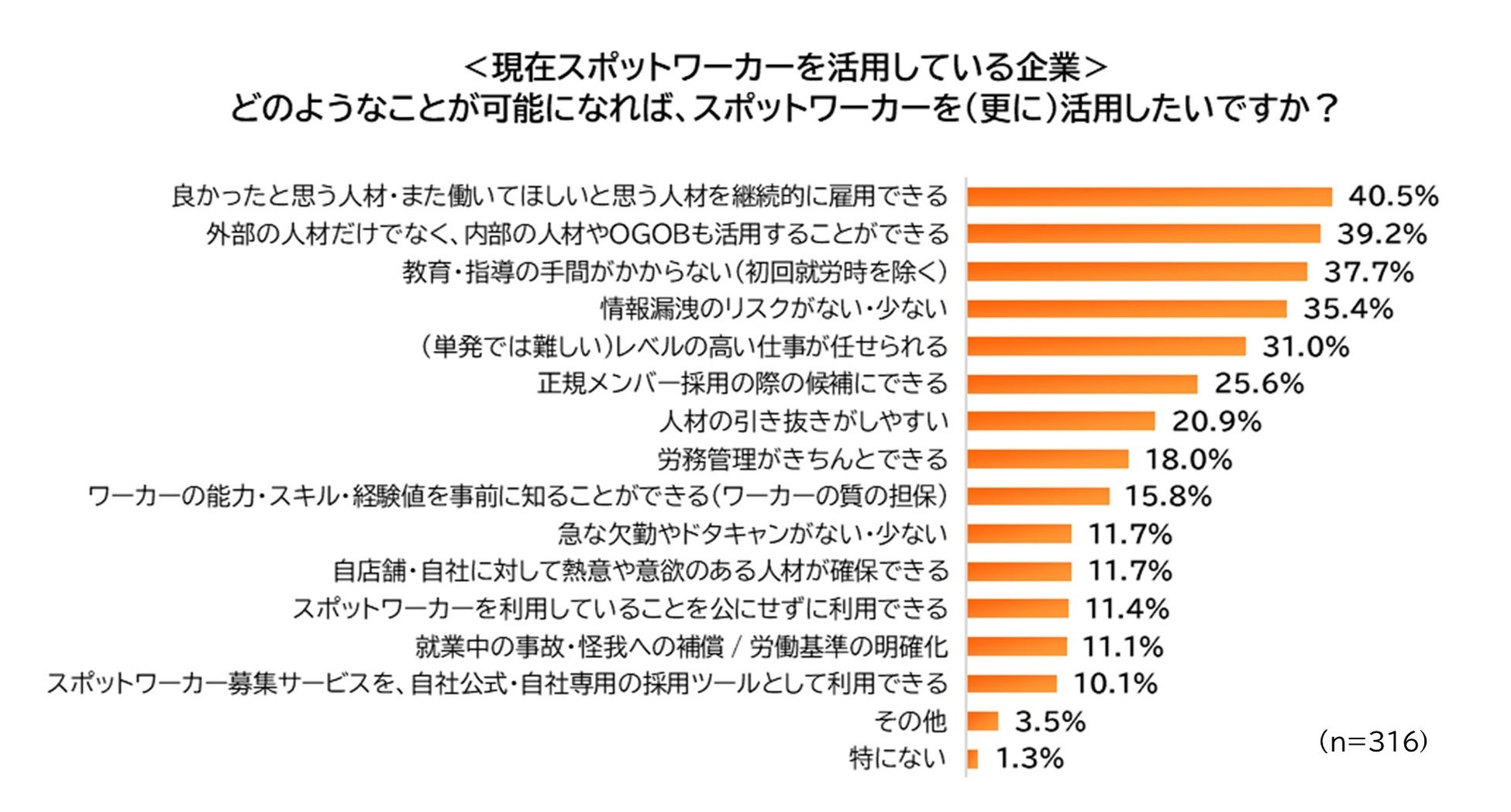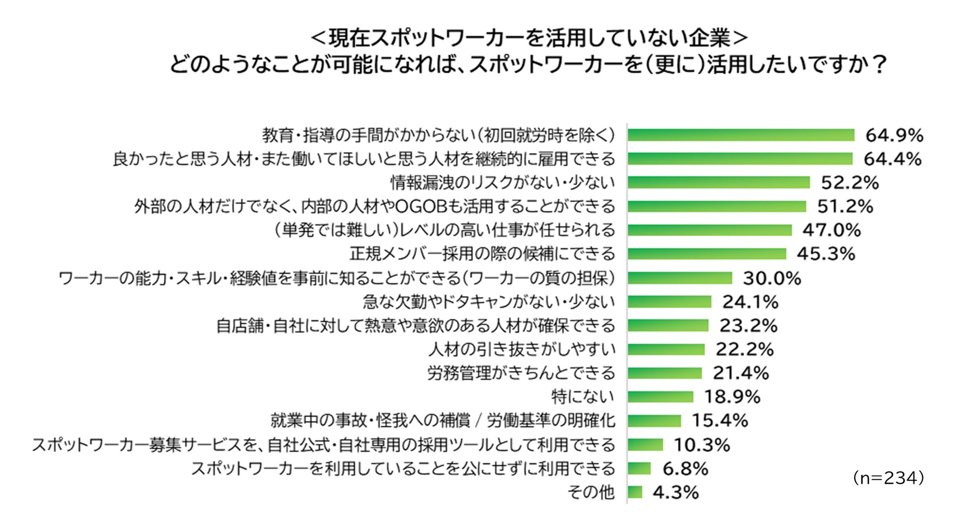 一方、現在スポットワーカーを活用していない企業では、「教育・指導の手間がかからない」が最多(64.9%)、僅差で、「良かったと思う人材・また働いて欲しいと思う人材を継続的に雇用できる」(64.4%)となりました。