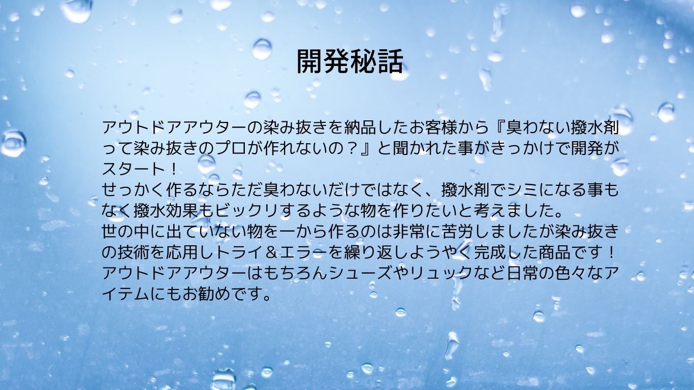 弊社は東京八王子で衣類やバッグの染み抜きに特化した宅配クリーニングサービスと行っております。 そんな染み抜きのプロがご家庭で簡単に使って頂ける殆ど臭わないスプレータイプの撥水剤を開発しました。