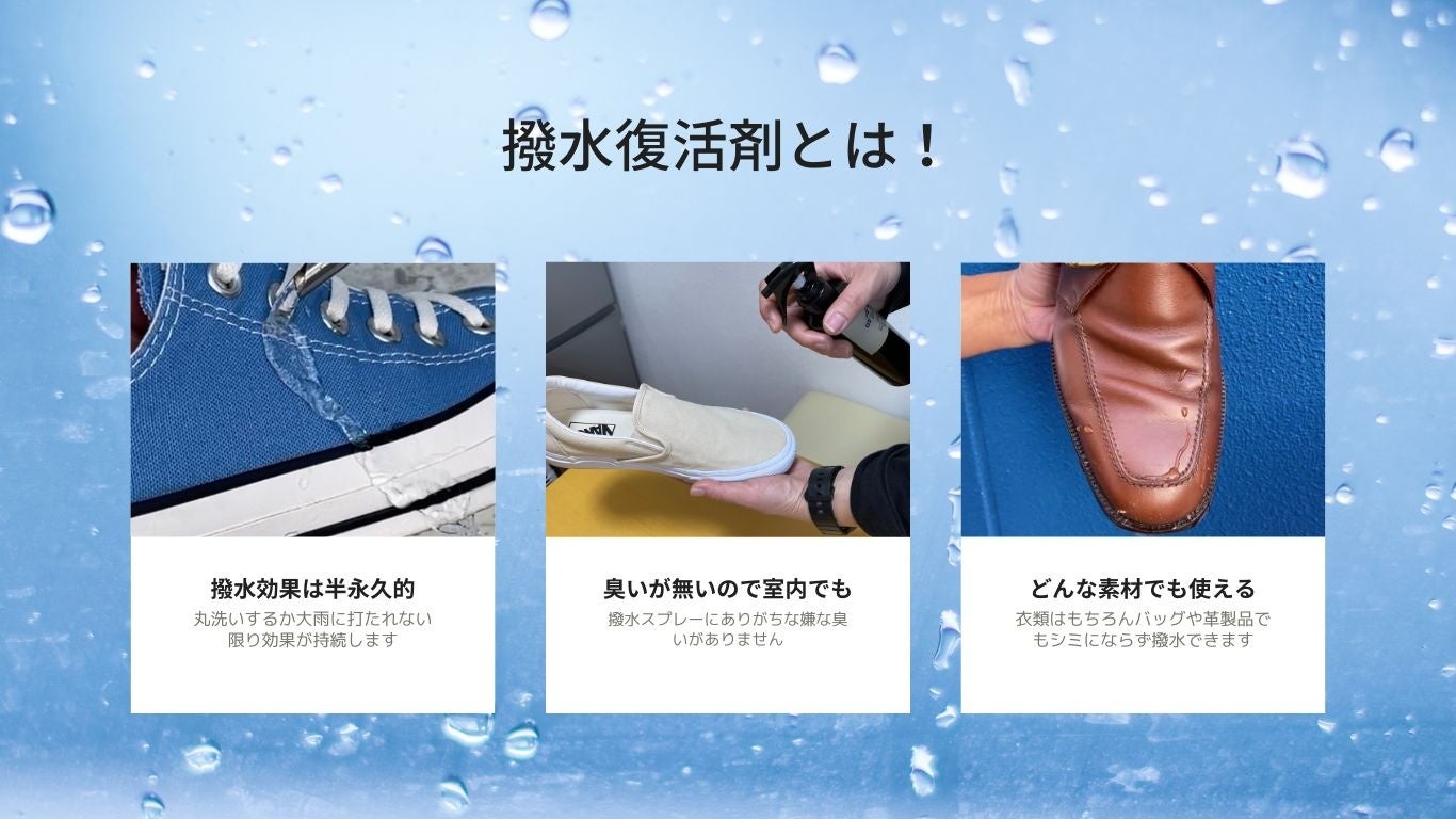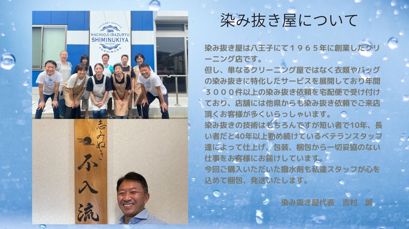 染み抜き専門店が開発した臭いを感じることなく超撥水できる撥水スプレーです。革やバッグなども撥水可能です。