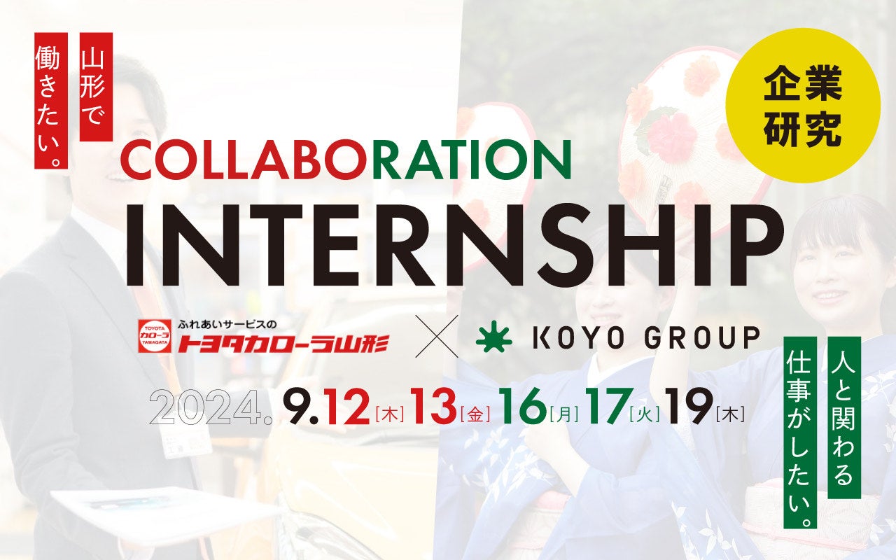 「今日、この瞬間に、最高の山形を。」を理念に、山形県内に4つの宿泊施設やグランピング、山形県初のプリン専門店などを展開する「古窯グループ」(株式会社古窯ホールディングス 代表取締役専務:佐藤太一)は、トヨタカローラ山形株式会社(山形市)と共同で山形県初のコラボインターンシップを実施いたします。同インターンシップは、2024年9月12日(木)~13日(金)・16日(月)~17日(火)・19日(木)の日程で実施、「山形で働くこと」「人と関わる仕事」に興味がある学生の皆さんに、地元企業をより深く知っていただくことを目的にしたものです。両社を会場に、2日間ずつの就業体験、最終日には自己分析ワークを実施いたします。自動車販売業と観光業という異なる業種での体験が可能、また、多角的な視点から企業研究が可能なインターンシップです。