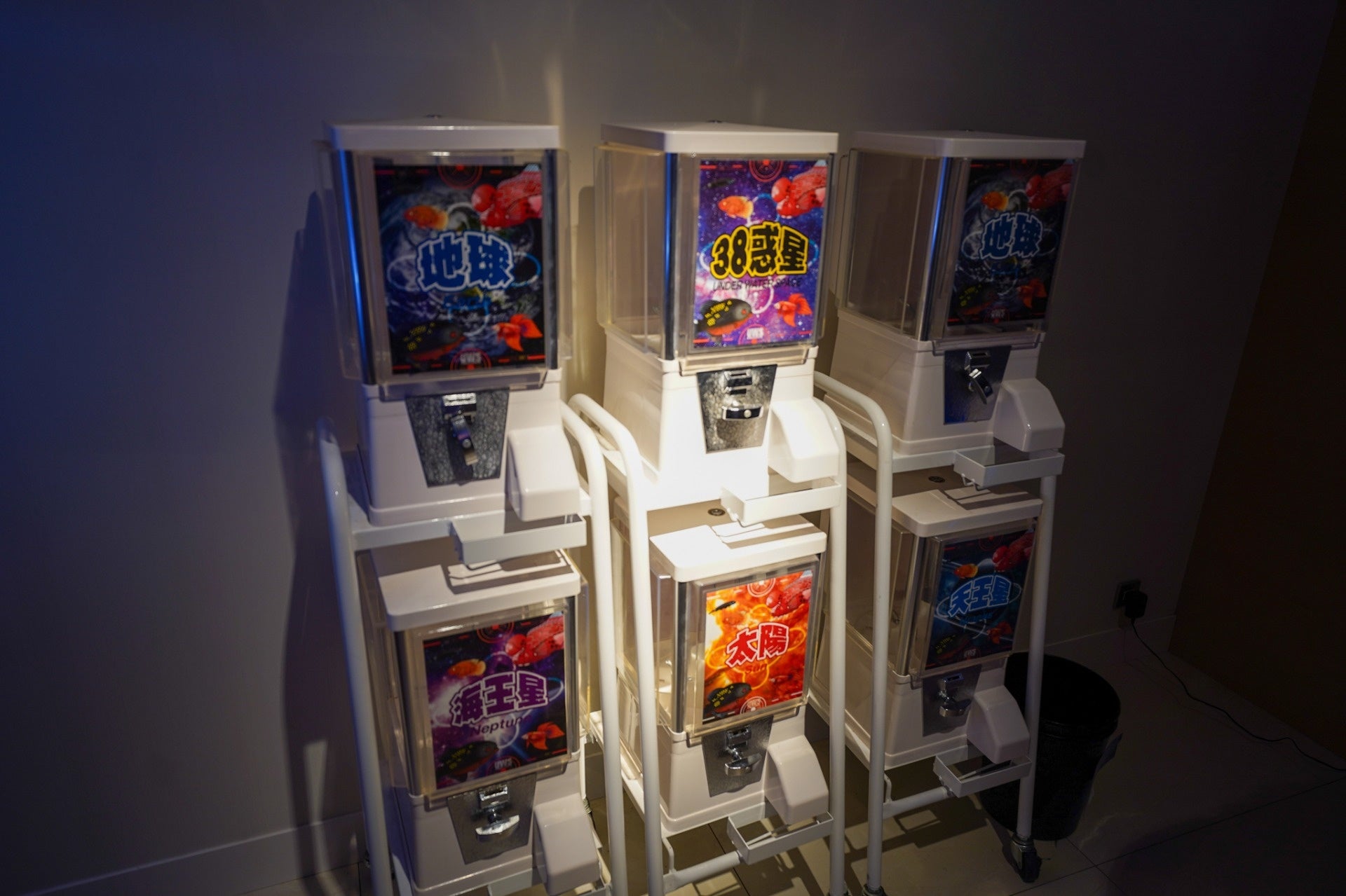 【 エリア6: 宇宙魚すくい 】プロジェクションマッピングの技術を活用した、デジタルの体験型コンテンツ。手のひらの上に宇宙魚をすくうと、惑星の文字が浮かび上がる演出。専用のガチャガチャを引くことで宇宙旅行の記念品がもらえます。