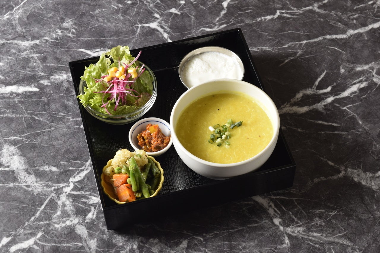 インドのヘルシーな美容食“キチュリ”。豆のタンパク質がたっぷり摂れる栄養満点のお粥です。胃腸に優しく体の調子を整えます。たっぷり野菜と自家製ヨーグルト、自家製アチャール(インドのピクルス)付き。