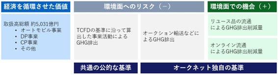 “環境” に与えた影響額には、サプライチェーンによる温室効果ガス排出量(Scope1・2・ 2 3)およびオークネット独自で算出した「機会(リユース品の流通による潜在的な温室効果ガス排出減少量やオンラ イン市場による潜在的な温室効果ガス排出減少量)」と「リスク(オークションで取引された商品の輸送の際 に発生した温室効果ガス排出量)」が含まれます。