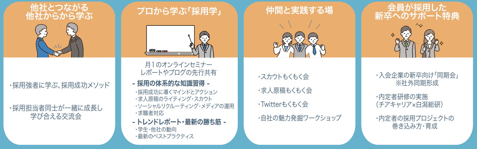 そこで、【中小ベンチャー企業の社長を元気にする】という存在意義のもと、企業の採用支援だけでなく、人材研修・組織活性化コンサルティングなどを人材領域に携わる事業を総合的に取り組む白潟総合研究所とベンチャー・成長企業のための就職サイトを運営するチアキャリアがタッグを組み、中小ベンチャー企業の採用担当が共に学び、成長していけるコミュニティを発足することに致しました。