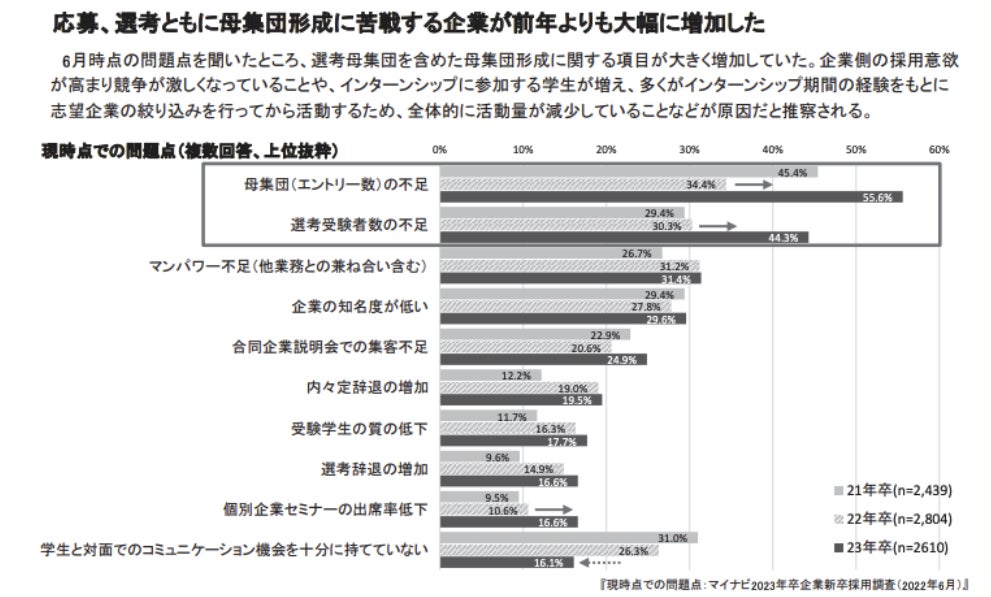 また、採用活動の問題点として毎年上位に上がるのが【マンパワー不足】。採用担当者の拡充と、それらに協力してくれる社員の育成が不可欠です。