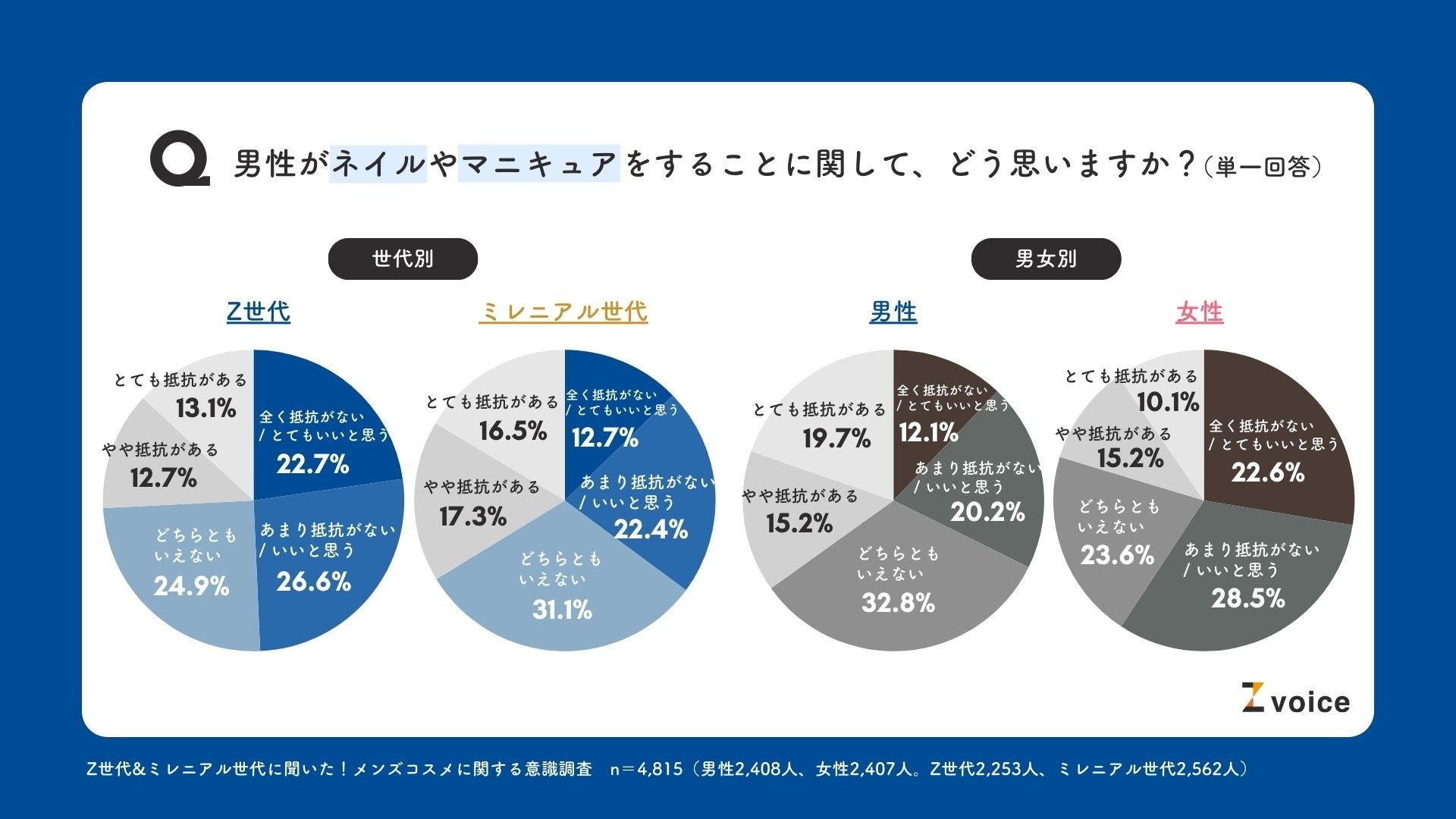 次に、男性がネイルやマニキュアをすることに関しても、メイクと同じくZ世代が肯定的である模様。
