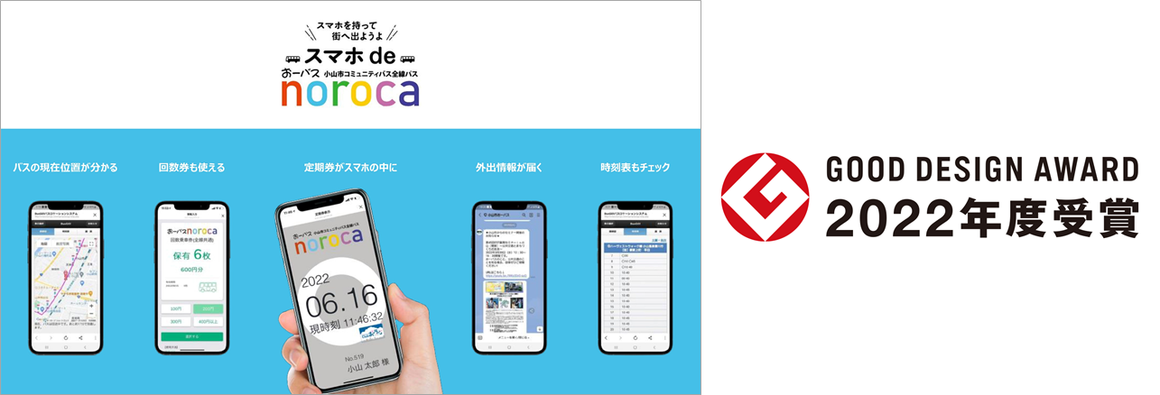 モバイル乗車券 [スマホ de noroca] は、小山市が公共交通サービスの利便性向上を目指し、MaaS等の新技術導入を検討していたなか、小山市コミュニティバス「おーバス」の全線共通定期券であるnorocaを、コミュニケーションアプリLINEを活用して2021年に電子化したものです。「おーバス」のLINE公式アカウントから友だち登録し購入しておくと、バス降車時に運転手にスマホのLINE画面を提示するだけのシンプル設計となっており、老若男女誰もが使いやすく、交通系ICカードと比較して、導入・維持費用の大幅なコストダウンを実現しています。これらの取り組みの結果、このたび「グッドデザイン賞」として高く評価されることになりました。