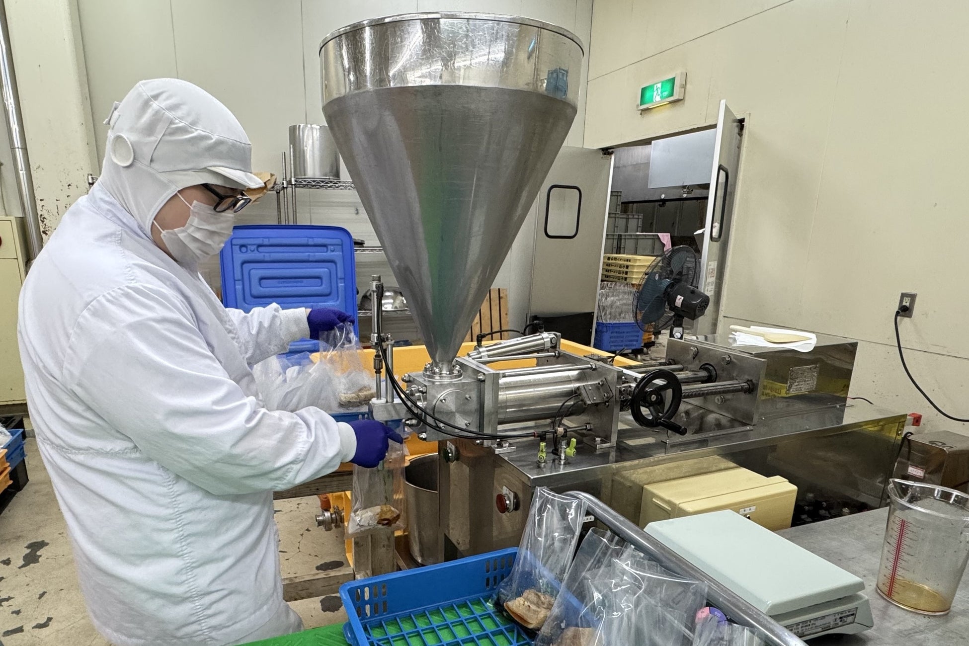 1食分の豚バラを入れた袋に特製のタレを充填し、すぐに真空包装し、製造後から新鮮な品質のまま工場直送で店舗へ配送しています。