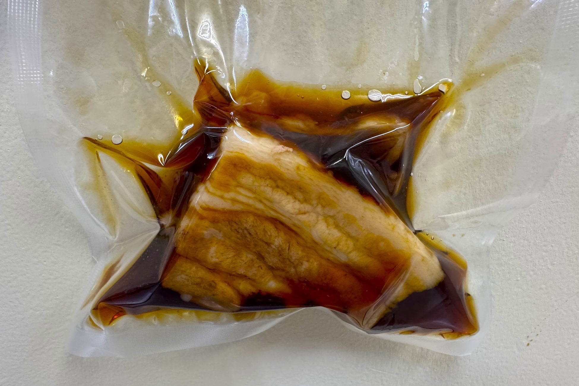 また真空状態で自家製のタレにじっくり漬け込むことで、厚切りの豚バラ肉にタレがしっかり染み込んだ特製の角煮が完成します。