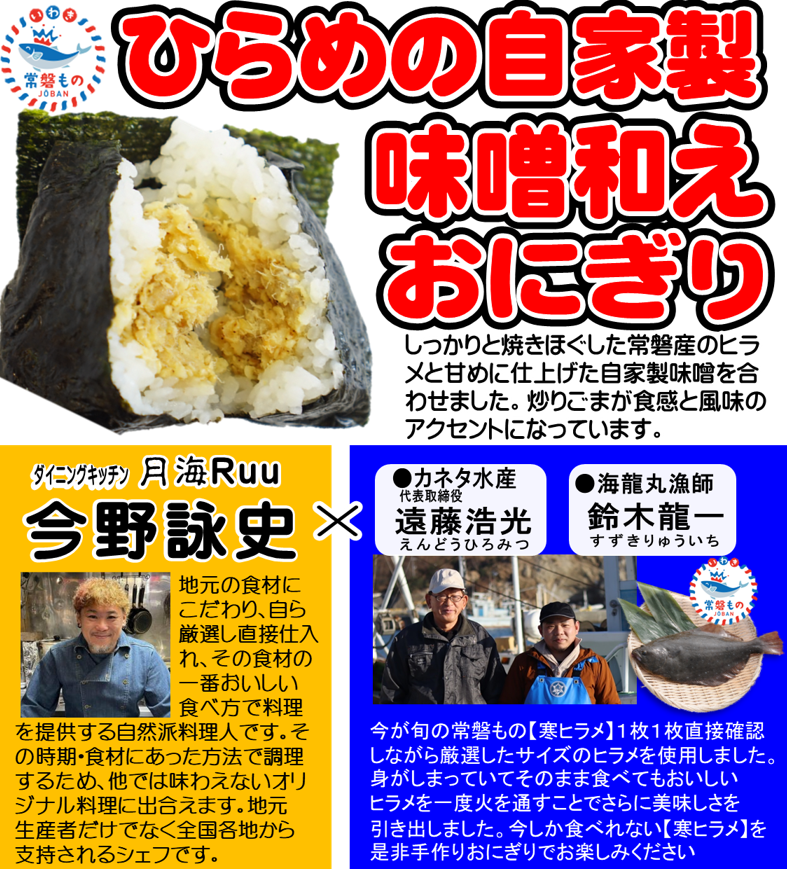 ①今野シェフ監修「常磐ものひらめの自家製味噌和えおにぎり」