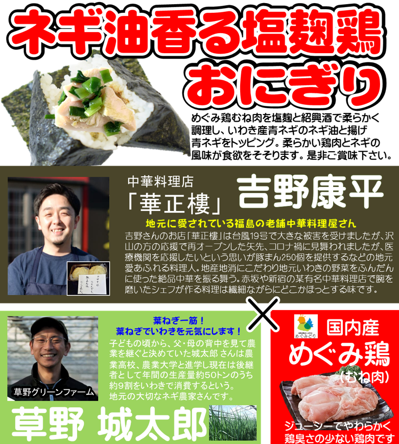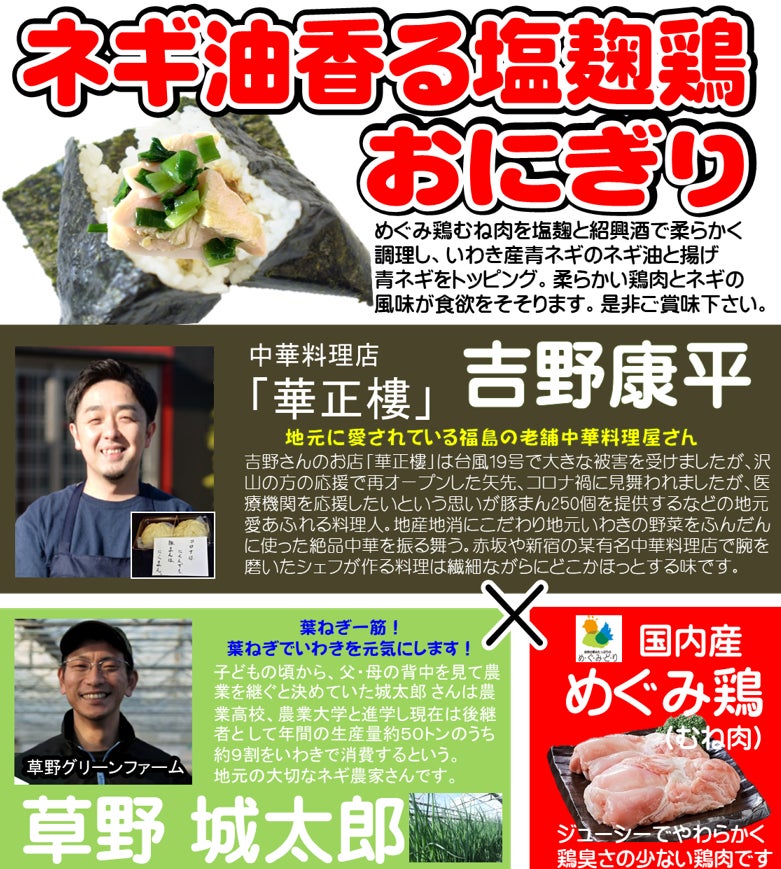 日本一受賞おにぎりコラボ企画(復刻第19弾)福島県産の食材を使った『常磐ものひらめの自家製味噌和えおにぎり』『ネギ油香る塩麹鶏おにぎり』期間限定発売
