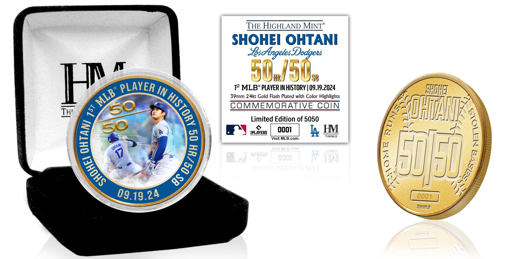 ドジャース 大谷翔平選手のMLB史上初50/50を達成した記念したメモリアルグッズです。記録達成となった、9月20日マリーンズ戦でのホームランシーンと盗塁が収められています。記念すべき50/50とドジャースのロゴがあしらわれたプレミアムコインが付属しています。全世界数量限定5050個、オリジナルデザイン、この期間のみ販売いたします。