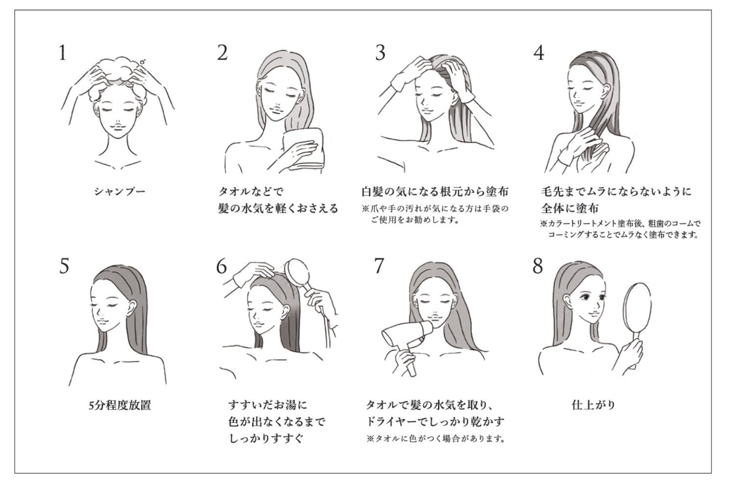 ※白髪の多い部位には塗布量を多めにするか、少し長めに放置します。