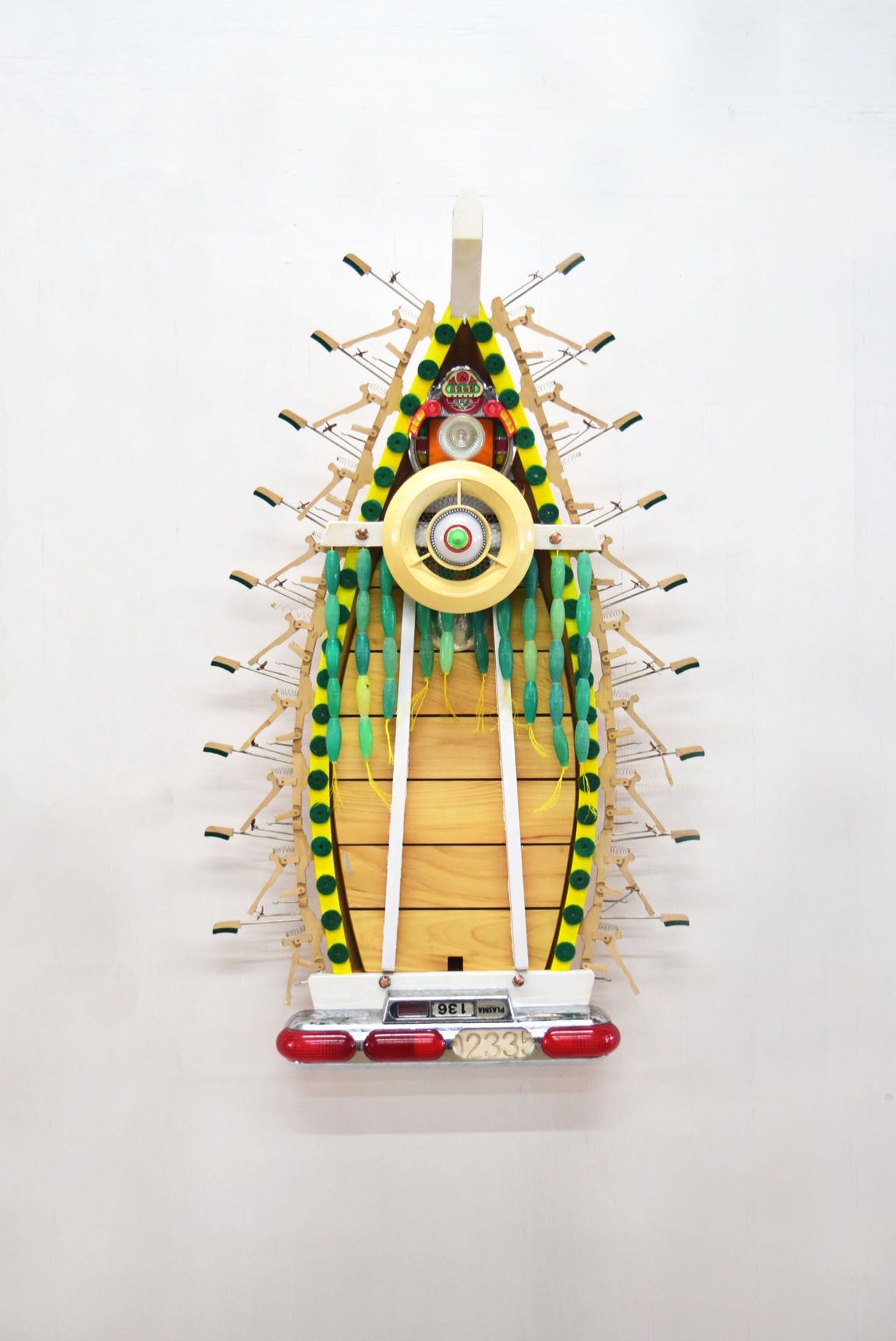 廃材でも同じ形状のモノを多用しシンメトリーを意識して作られる石田の作品は一定に刻まれるビート音のような覚醒性があり、鑑賞者は時空を飛び越える感覚が得られるでしょう。
