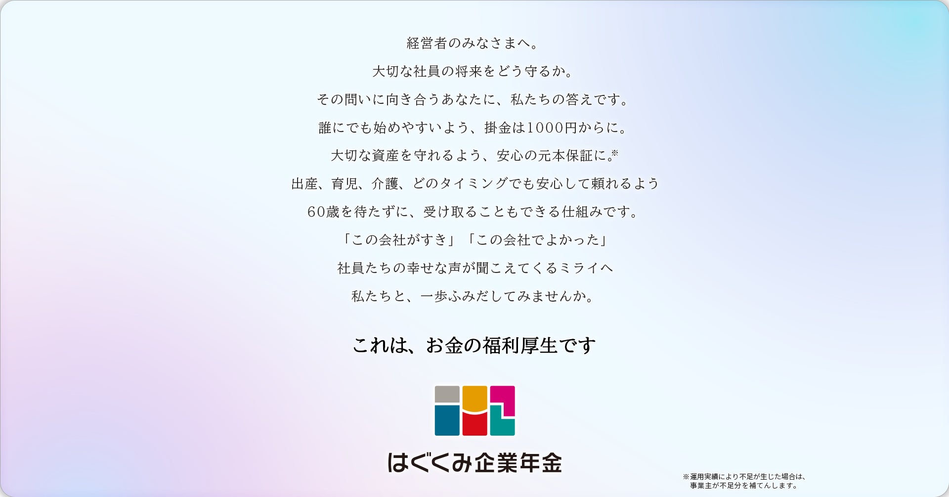 今後も「はぐくみ企業年金」をはじめとした企業年金制度をご利用いただくことで、全国の中小企業で働く方々が「お金の心配なく」「自分らしく働ける」社会の実現を目指し、邁進してまいります。