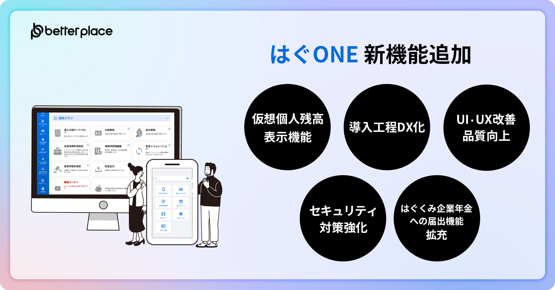 当社開発の企業年金DXシステム「はぐONE」に次々と新機能を追加。法人担当者様、加入者様双方にとってのさらなる使いやすさを追求しました。