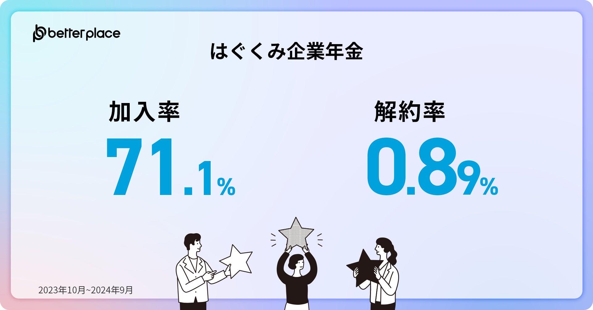 当社が開発した企業年金DXシステム「はぐONE」によりスマホ一つで申込や掛金の変更(原則年2回まで)、掛金シミュレーションが可能となっており、利用者様に使いやすいシステムで高い加入率*¹を実現。本年は「はぐくみ企業年金」の平均加入率が71%に達しました。それに対し、解約率は0.89%となっています。(2024年9月末時点。解約率=過去1年間の脱退事業所における加入者数÷1年前の加入者数)