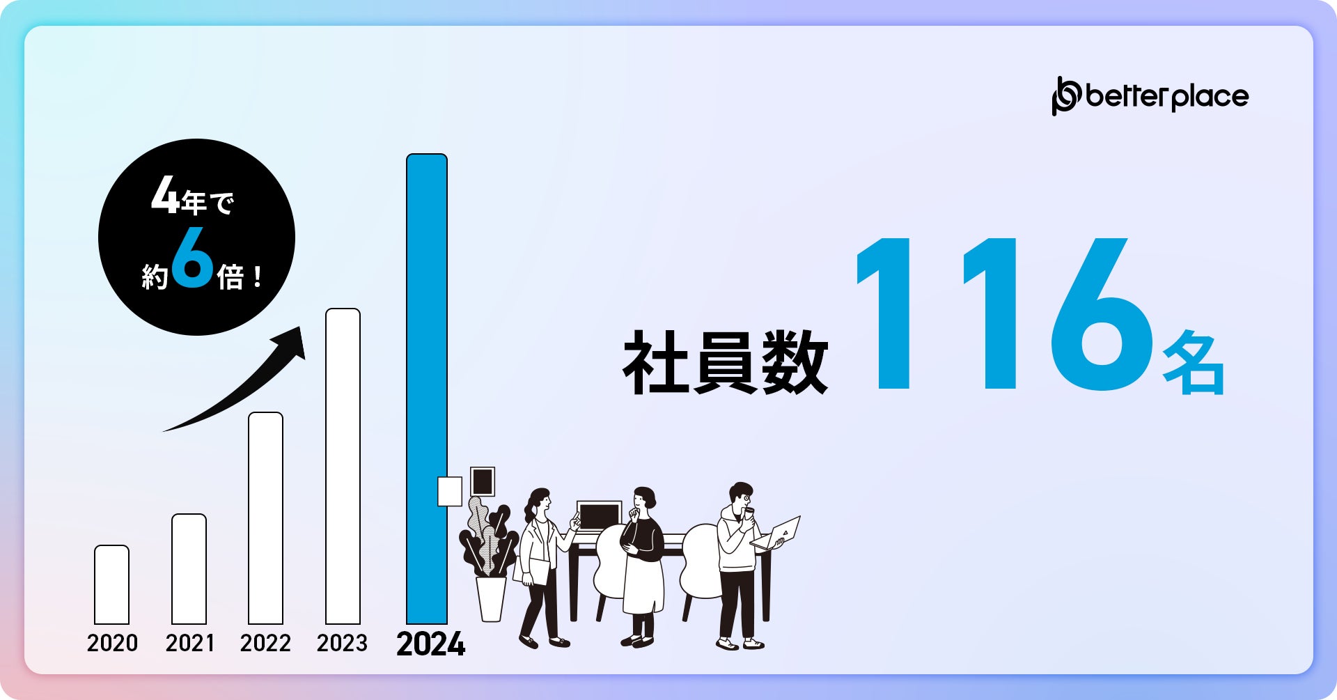 「ビジネスを通じて、子育て世代と子どもたちが希望を持てる社会をつくる。」という企業理念に賛同し、社会を支える皆様がお金の心配なく暮らせる社会の実現を目指す仲間が多く集まり、社員数は116名を超えました(2024年9月末時点)。過去4年間で約6倍に増加しています。