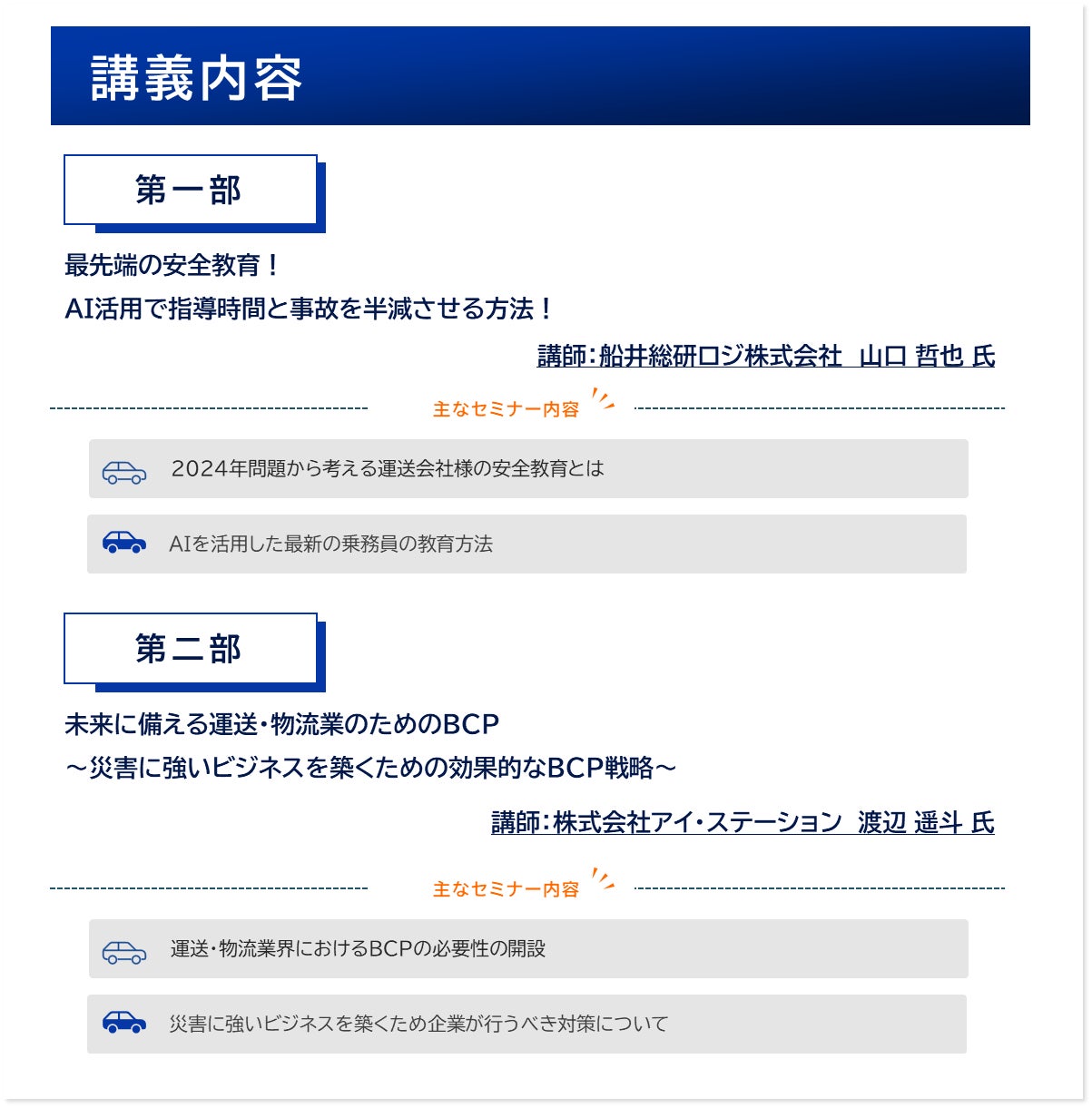 第一部では「AI活用による指導時間と事故を半減させる方法について」をテーマとし、運送会社・物流企業における事故防止の方法と効率的かつ効果的な指導方法についてお伝えします。また第二部では、自然災害や感染症の流行等による物流・運送業界で考えられる様々なリスクと、そのリスクを想定した対策手段をご説明いたします。