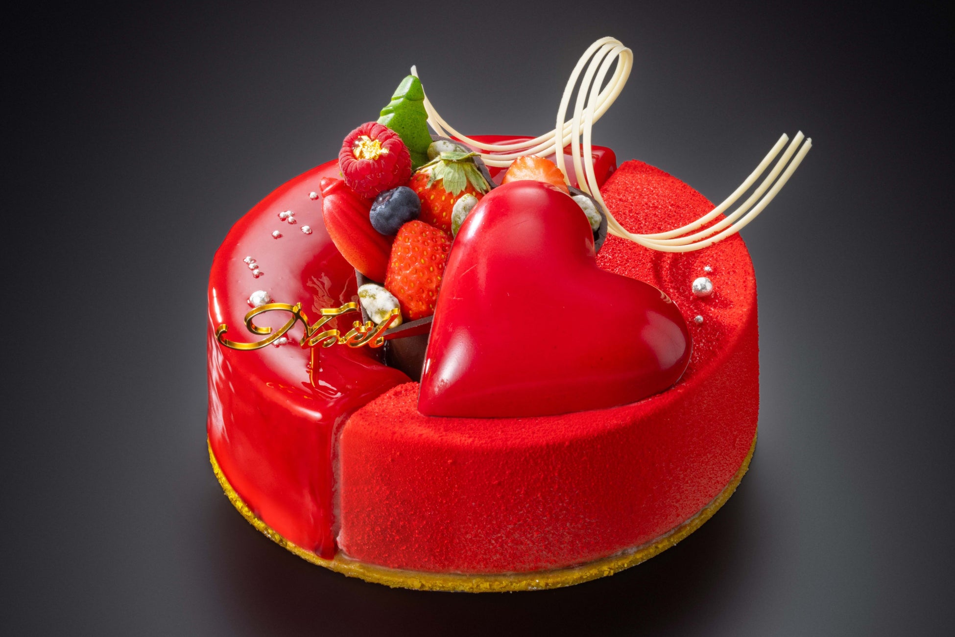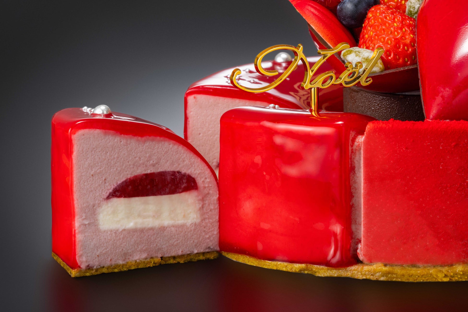 真っ赤なリースをイメージしたケーキの中心には、そっと隠されたプレゼントのようにたっぷりの苺が詰め込まれています。ルビーチョコとフランボワーズのムースの中は、フランボワーズと苺のジュレとフロマージュブラン。シンプルかつ上品な味わいと贅沢感を味わえるケーキです。