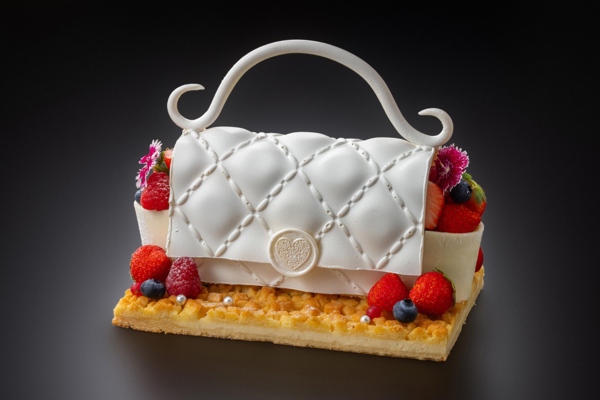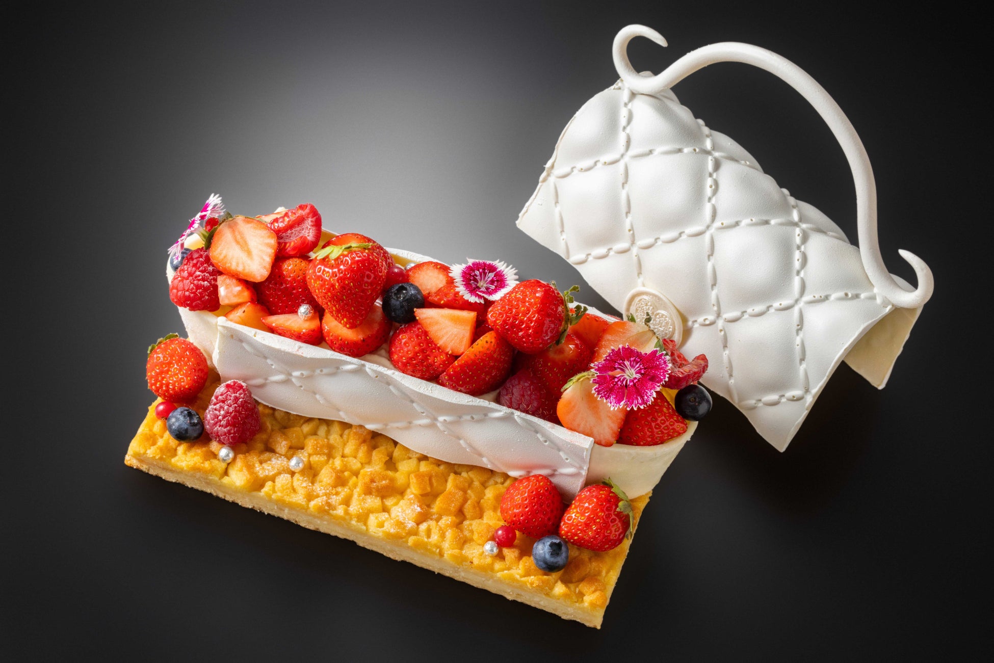 ホワイトチョコレートで作られたカバンの中は、苺とエディブルフラワーでぎっしりと埋め尽くされたショートケーキ。土台のチーズタルトはクッキー生地にサワークリーム、クリームチーズ、カスタードが重なり濃厚な味わいです。