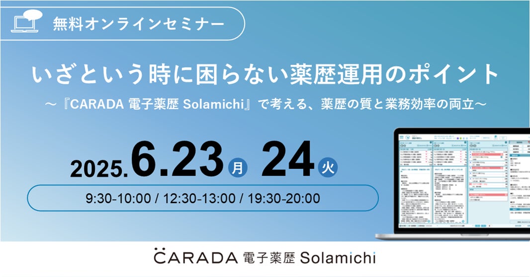 クラウド電子薬歴『CARADA 電子薬歴 Solamichi』の企画・開発・販売を行う株式会社ソラミチシステムは、無料オンラインセミナー「いざという時に困らない薬歴運用のポイント~『CARADA 電子薬歴 Solamichi』で考える、薬歴の質と業務効率の両立~」を6月23日(月)、24日(火) に開催します。