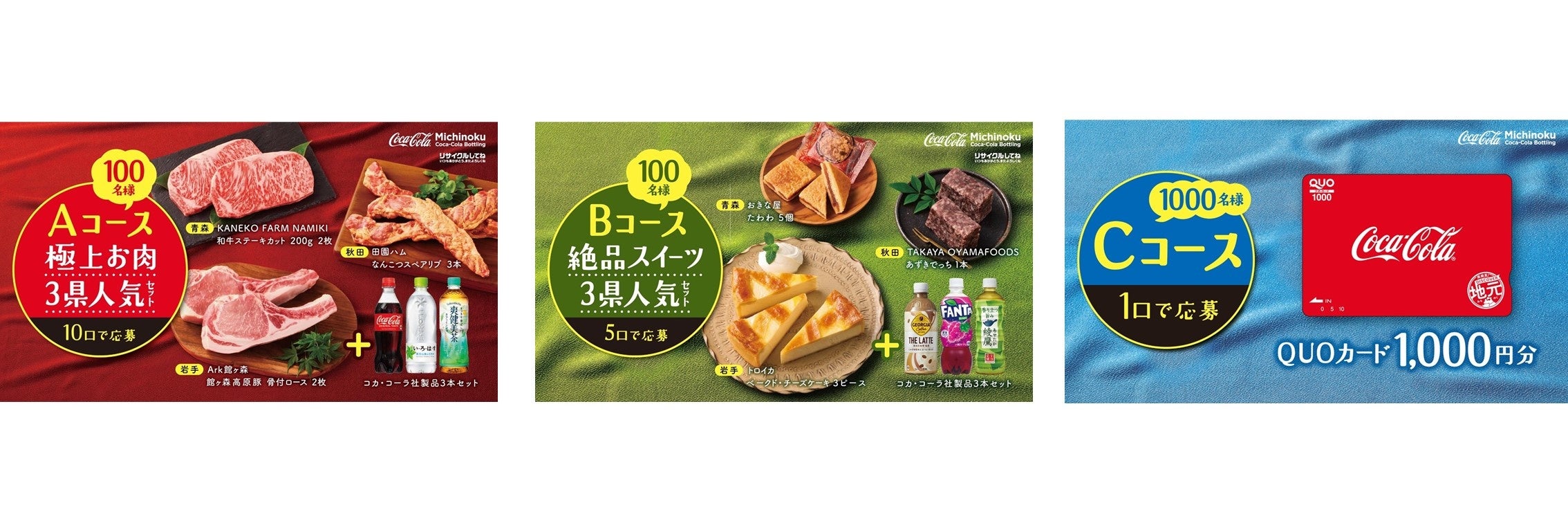 賞品: 【Aコース】10口応募<極上お肉3県人気セット>、【Bコース】5口応募<絶品スイーツ3県人気セット>、【Cコース】1口応募<QUOカード1,000円分>