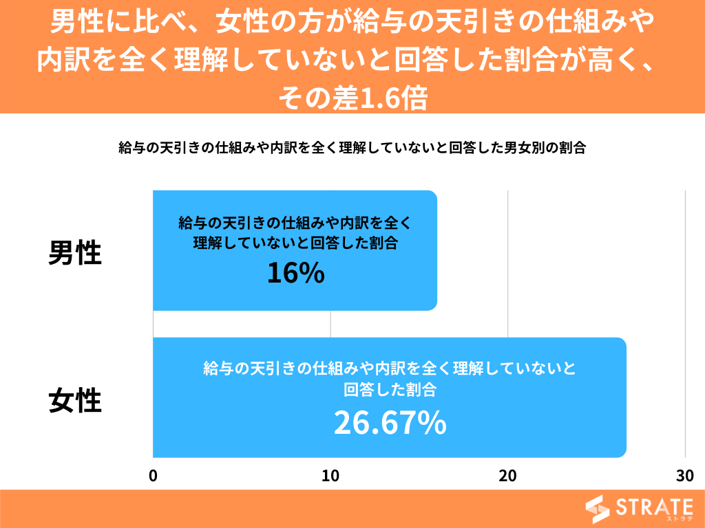 給与の天引きの仕組みや内訳を全く理解していないと回答した割合を男女別でみてみますと、女性が26.67%、男性が16%という結果になりました。