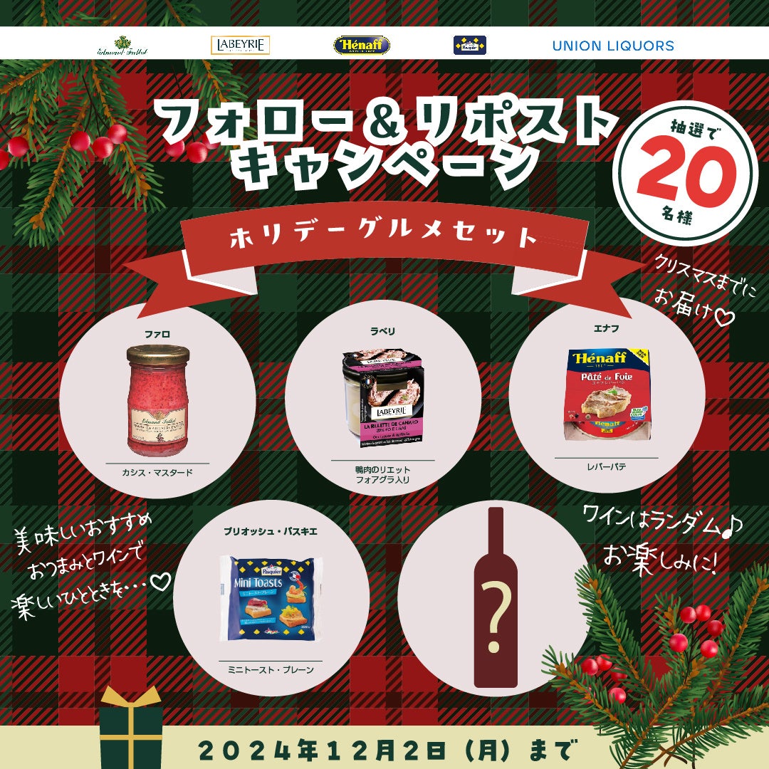 ファロ、ラべリ、エナフ、ブリオッシュ・パスキエ、ユニオンリカーズは、2024年11月28日(木)12:00~12月2日(月)23:59の期間中、X(旧Twitter)にてフォロー&リポストキャンペーンを開催いたします。当選者の20名様には美味しいおすすめおつまみとワインをセットにしてお届けする予定です。