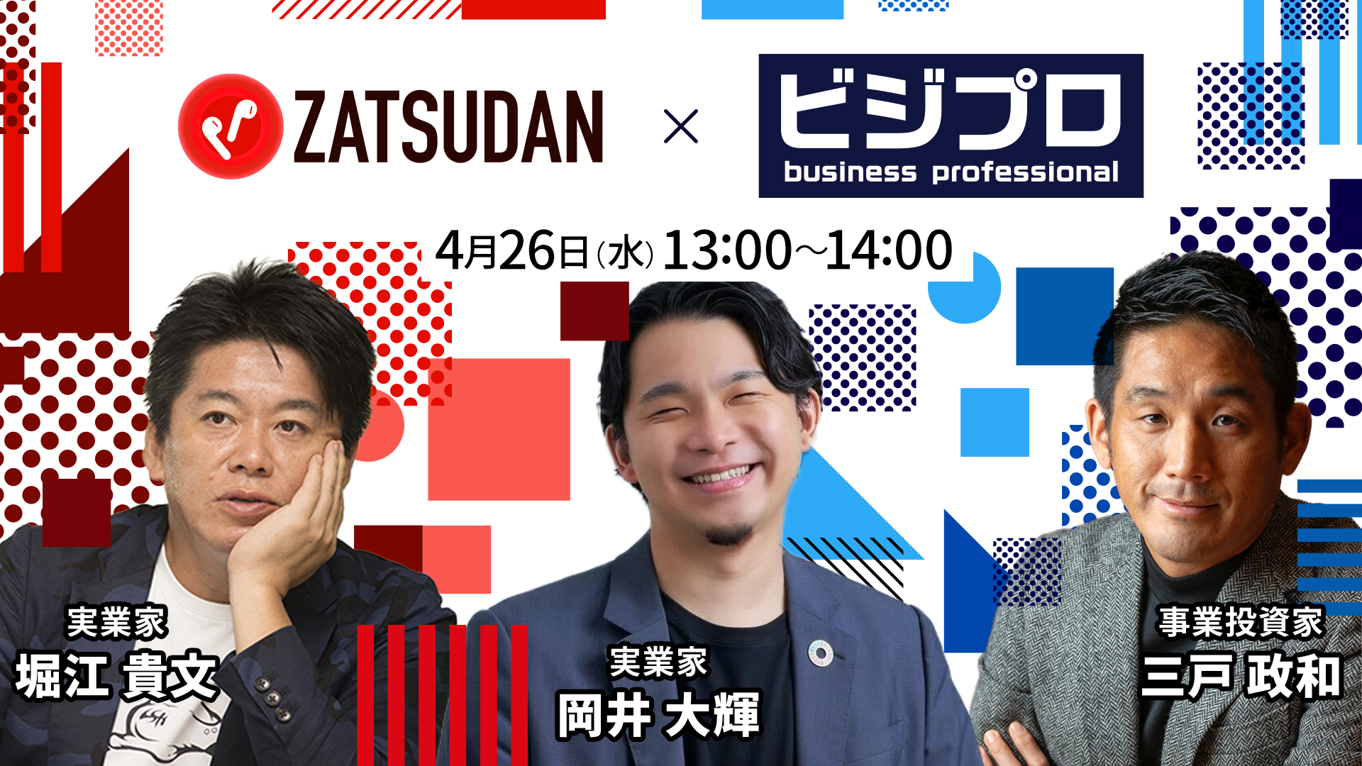 【ZATSUDAN】オンラインイベントのお知らせ(堀江 貴⽂⽒ × 三⼾ 政和⽒ × 岡井 大輝氏)