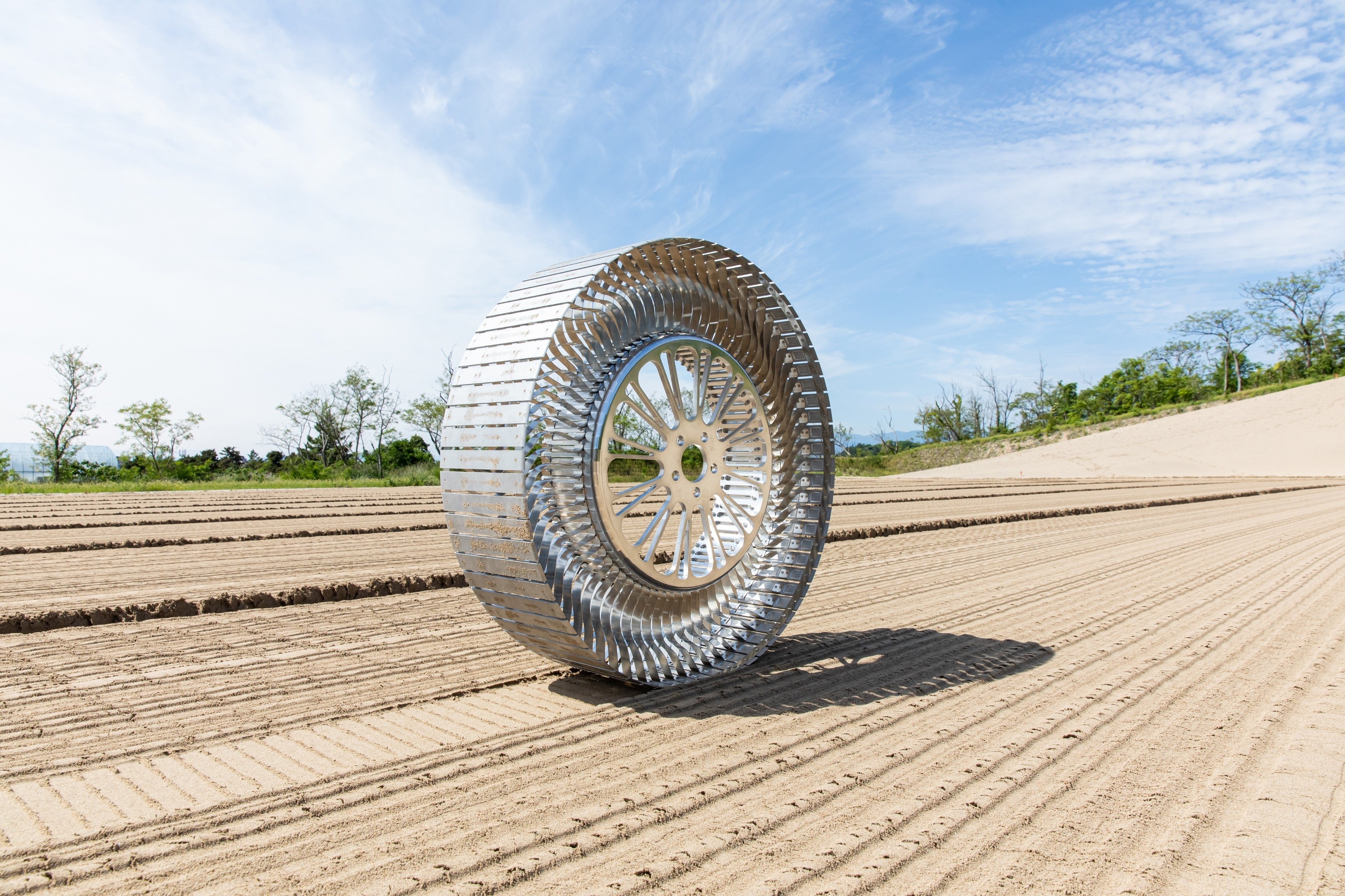 新構造では、空気充填が要らない次世代タイヤ「AirFree®」で培ってきた技術を活かして新たに薄い金属製スポークを採用し、トレッド部を回転方向に分割しています。これにより、岩や砂に覆われ真空状態で激しい温度変化や放射線にさらされる極限の月面環境下においても、走破性と耐久性の高次元での両立を目指します。また、リアルとデジタル技術の進化により金属製スポークの形状や厚みを構造シミュレーションで最適化し、しなやかに変形しながらも金属製スポークの局所的なひずみを最小化して耐久性を高めつつ、分割したトレッド部により接地面積を大きくしてタイヤを沈み込みにくくすることで、走破性もさらに向上させています。