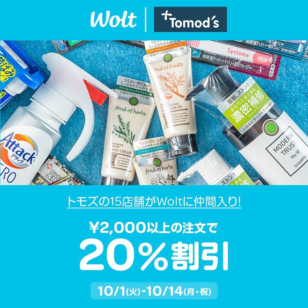 株式会社トモズ(以下、トモズ)は、2024年10月1日(火)よりデリバリーサービス「Wolt」のサービス提供店舗数を現在の6店舗から15店舗追加し、合計21店舗へと拡大いたします。また、エリア拡大を記念してお得なキャンペーンを実施いたしますので、この機会に是非ご利用ください。