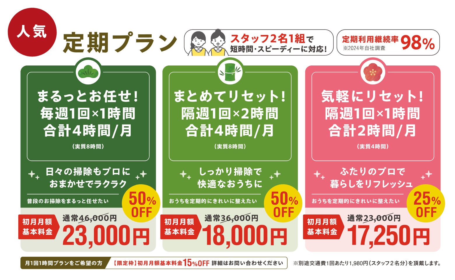 本キャンペーンは、日常的に家事代行サービスを利用してみたい方が気軽に定期利用を始められるよう、初月基本料金を最大50%OFFでご提供するお得な内容です。