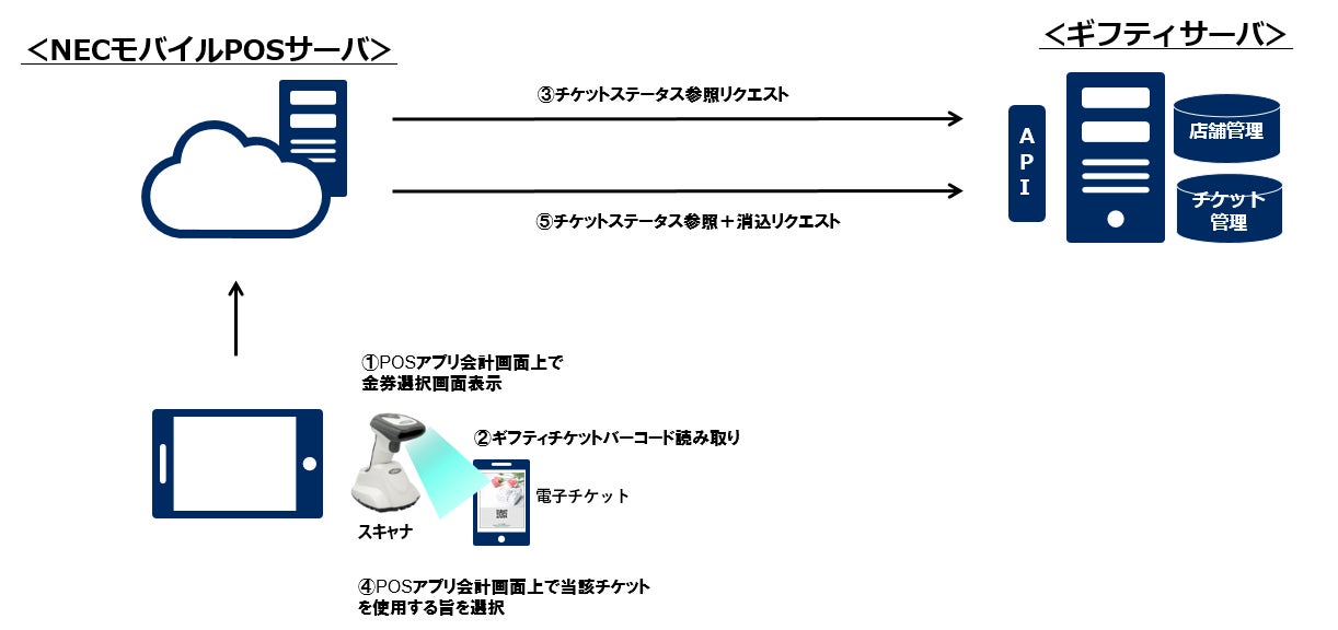 今回の連携により、NECモバイルPOSのPOSアプリ会計画面から「eGift System」で発行されたeギフトを読み取ることで、該当チケットを使用することができるようになります。
