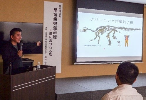 特別講演会は、市龍翔博物館の笠松雅弘館長が小林さんと昔から知己がある縁で実現。今年が〝龍年〟であることや同博物館が「龍翔」と名がつくことから、小林さんのこれまでの恐竜研究だけでなく、「龍にまつわる話」を盛り込んだ。集まった恐竜ファンたちからは、小林さんが恐竜の写真スライドを出すたびに、「あー、カムイサウルス、大好き」、「トリケラトプスや、かっこいい」の声が会場に飛び交い、学校のひと場面ように子どもたちが「恐竜の知識を披露する」場面もあるなど、にぎやかな講演会となった。