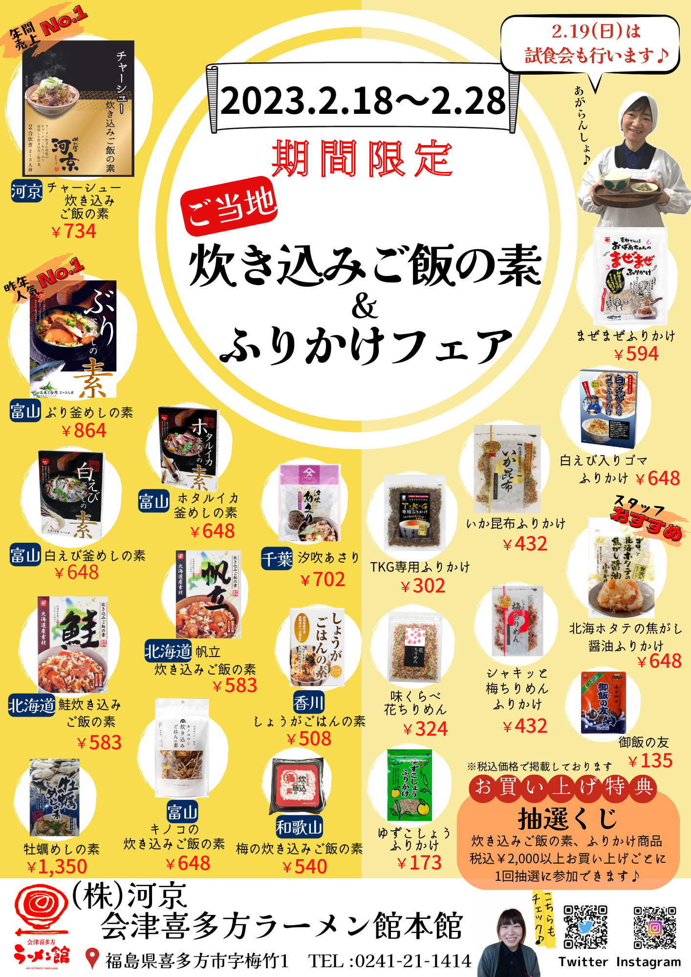株式会社河京 会津喜多方ラーメン館本館(本社:福島県喜多方市、代表取締役:佐藤富次郎)は、スタッフ厳選の「ご当地炊き込みご飯の素&ふりかけフェア」、河京自慢の自家製チャーシューを特別価格での販売、前回のつながるサミットで大好評だった卵のつかみどり、河京工場直送のラーメンつかみどり、地元のお店の人気フード販売なども行う「第4回つながるサミット」を2023年2月19日(日)に開催致します。