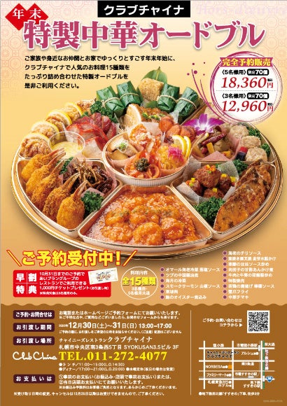 年末のご家族で囲む食卓に中華のオードブルはいかがですか。10/31までのご予約で早期予約特典も