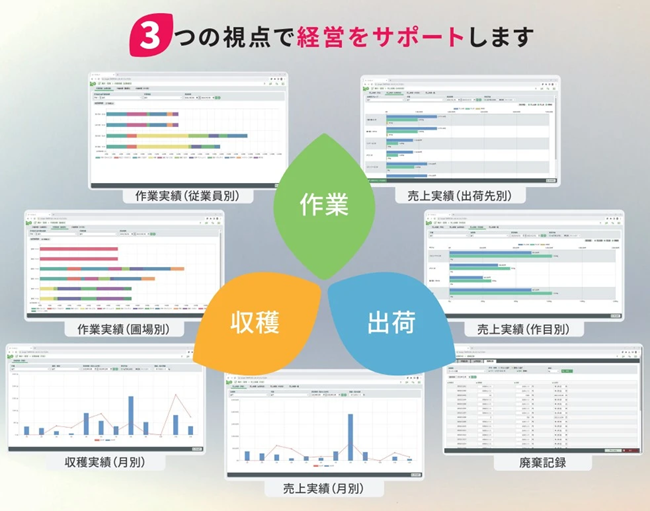 「ベジパレット」は3つの視点(作業・収穫・出荷)からデータを蓄積し、圃場単位・作付単位に収支を可視化することで、農業経営における課題の解決を支援します。